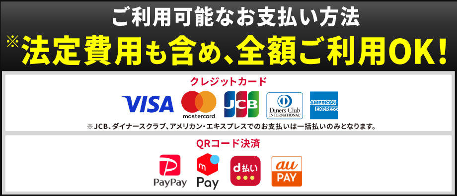 お支払いは現金の他、クレジットカード(VISA・マスター・JCB・アメックス・ダイナース)、QRコード決済(PayPay・d払い・auペイ・メルペイ)がご利用いただけます。